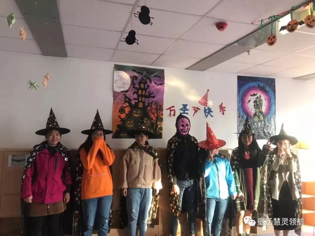 图为老师们穿上万圣节服装,准备为孩子们发糖!